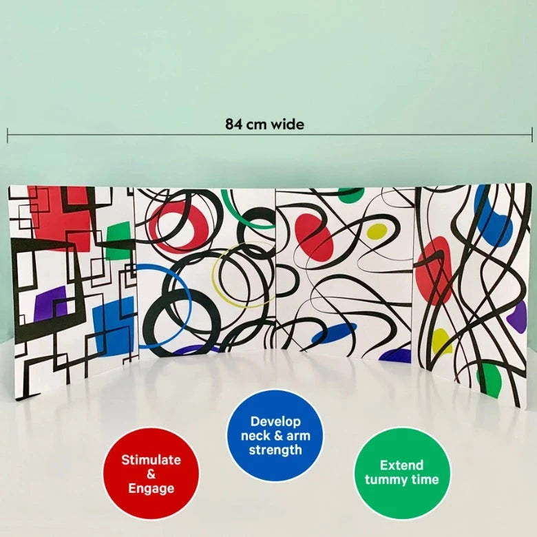 Benefits of the baby sensory tummy time board. The board stands alone so your baby can start to try and explore the world around them.