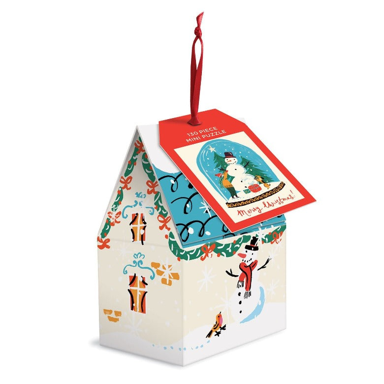 The Snow Globe is both an ornament to hang on the tree and a mini puzzle to offer as a gift. The puzzle features a colourful illustration of a car loaded with presents. The puzzle pieces are boxed in a charming little house ornament decorated for the holiday. Includes red ribbon for hanging.
