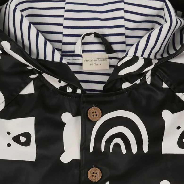 This rain bear print jacket is great for those rainy, cold days and muddy puddles splashing outdoors. Designed with waterproof fabric our sustainable jacket is made from 28 recycled plastic bottles destined for landfill. Lined in striped soft organic cotton, our contemporary prints bring a whole new look to eco-conscious outerwear.