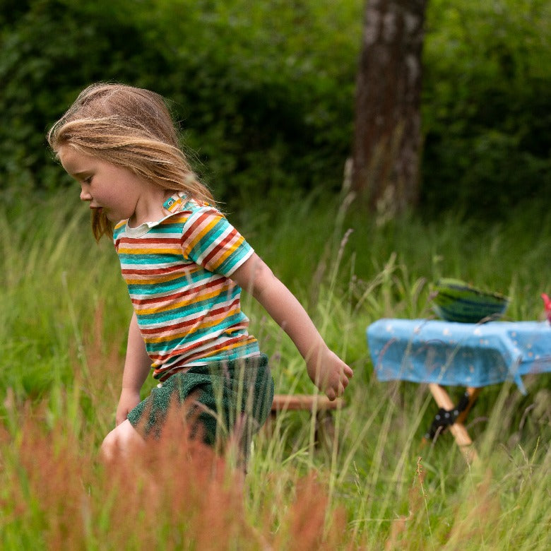 This fun rainbow striped t-shirt is made from light and breathable organic cotton fabric that will keep them cool all summer long.