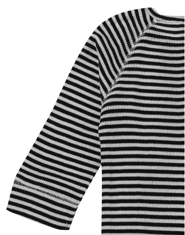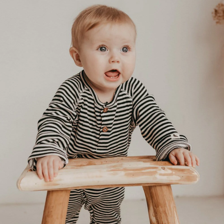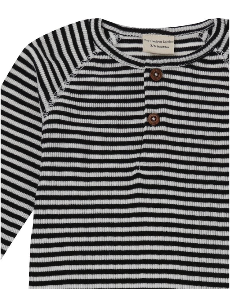 Part of Turtledoves 'Forever Loved' collection this ribbed stripe playsuit is made from organic cotton and is suited for all seasons. This monochrome playsuit is soft and gentle on delicate skins and the environment too. Wood effect button fastenings to the neck and poppers to the legs make for easy dressing.